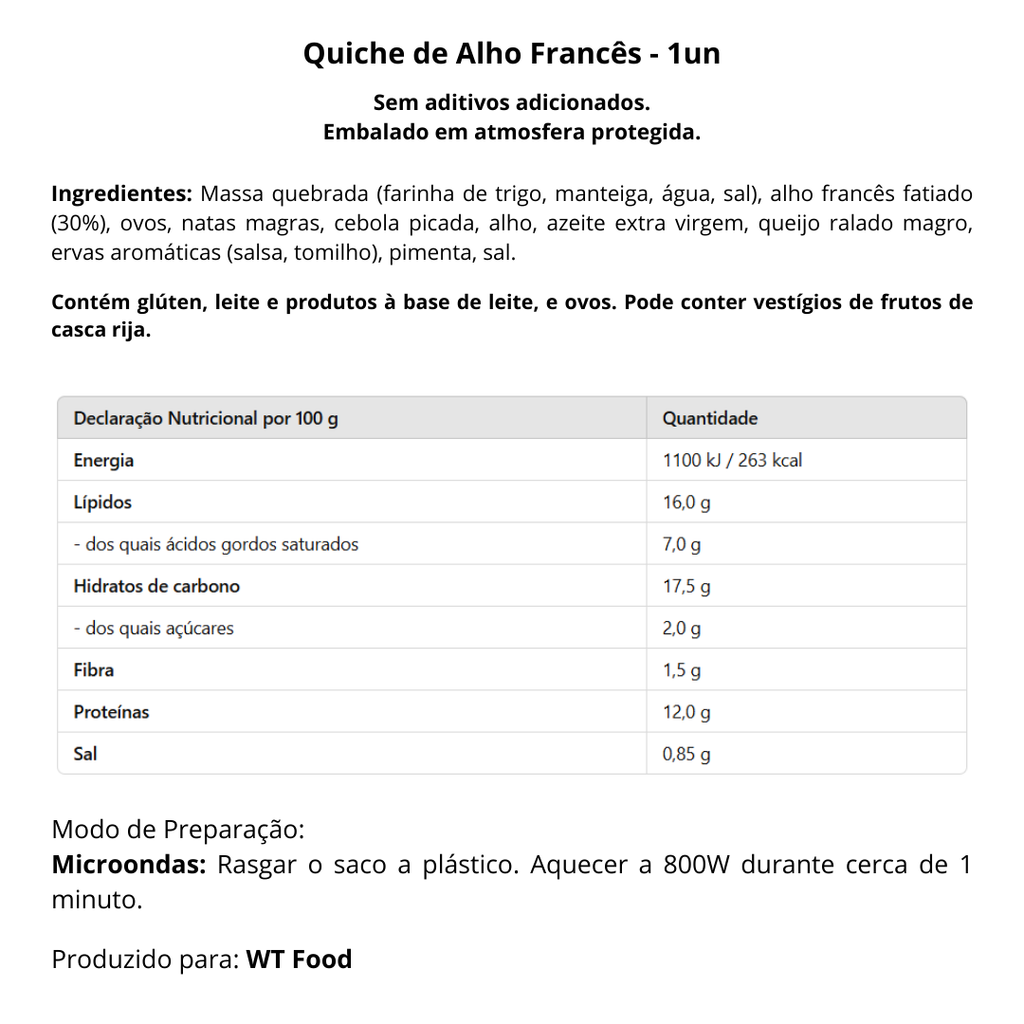 Uma opção leve e saborosa, ideal para qualquer refeição! A nossa quiche de alho-francês combina uma base crocante com um recheio cremoso, repleto do sabor delicado e único do alho-francês. Perfeita para um almoço rápido, um piquenique ou um jantar descontraído. Saboreie qualidade e frescura em cada fatia!
